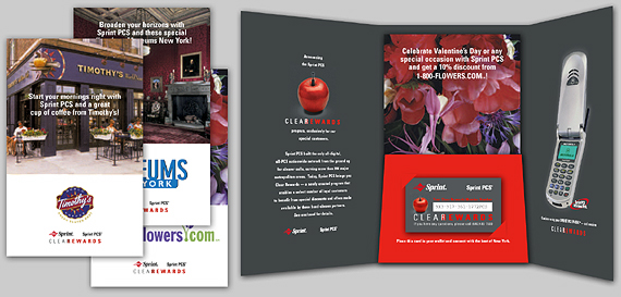 Mediums: staggered direct mail program supported by outdoor advertising (billboard, phone kiosk, and subway) "Clear Rewards" was a direct marketing loyalty program for the New York region, implemented with the goal of reducing deactivation rates of Sprint PCS plans by offering existing customers several third-party services at discounted rates. Such services included offers from local companies such as as 1800-flowers.com, Timothy's Coffee, and Golf Digest. Execution of this direct response initiative presented three critical challenges: Staying within the established Sprint PCS branding guidelines; targeting the message and feel specifically to the NY metro area; and combining a volume of information into an attractive, easy-to-read package. Suazion's solution included an initial mailing containing a "Clear Rewards" membership card and several inserts detailing third-party offers, as well as creation of coordinating package components such as stationery and envelopes. As follow-up, Suazion created three branded postcards, sent out at one-month intervals after the initial mailing. Extensive local advertising, including billboards, phone kiosk, and subway ads, further supported the loyalty program. "We had great results from the very beginning. Our deactivation rate was cut in half over a period of three months," summarizes Lisa Walsh, Senior Marketing Analyst for Sprint PCS. Below: Inside of the "Clear Rewards" promotional package with membership card and enclosures. Bottom row: One of the campaign's billboards. |